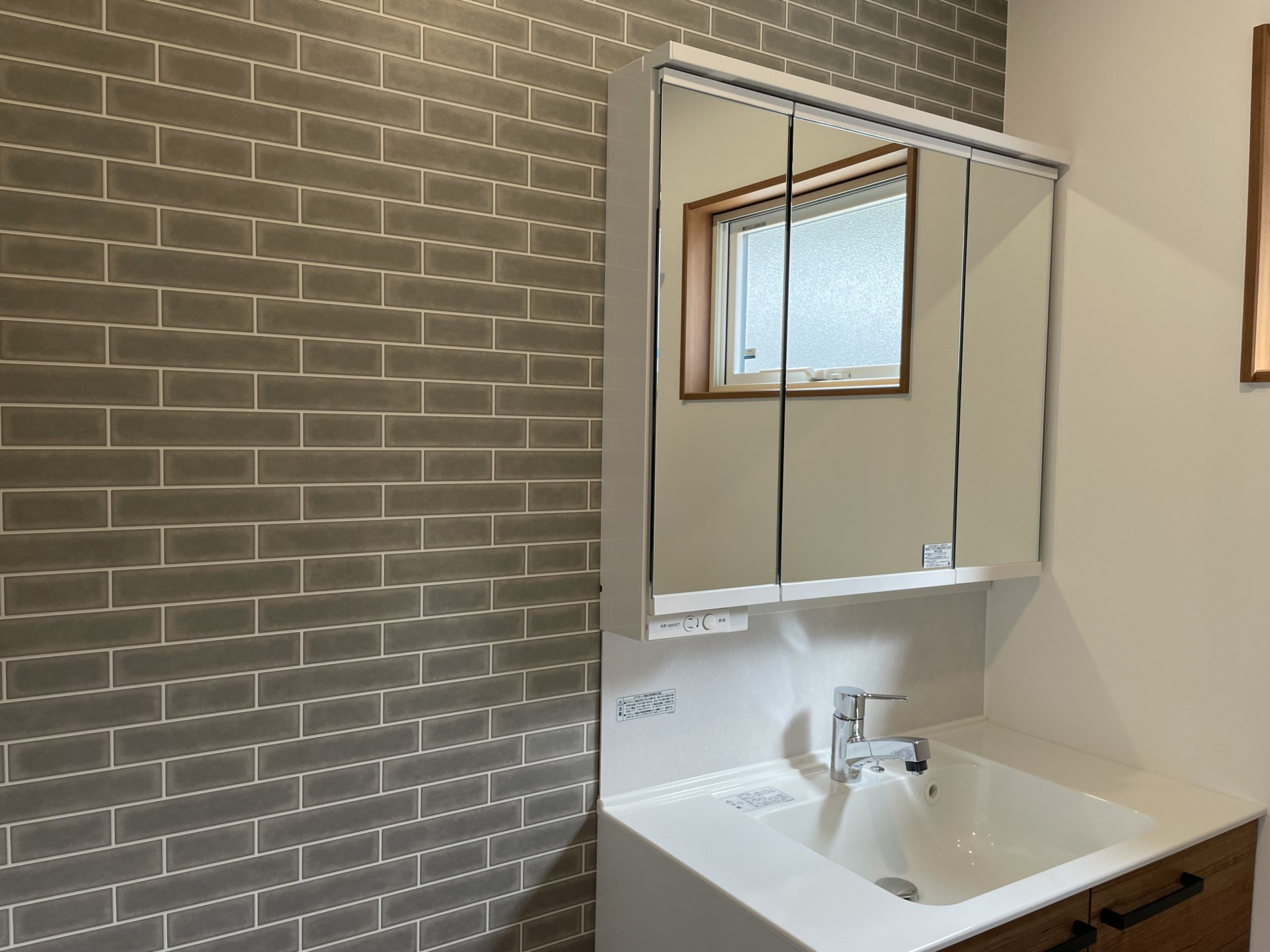 内装のポイントは、お客様がセレクトされたブルーグレーのタイル調のアクセントクロス。北欧らしい柔らかさと洗練された雰囲気を演出しています。