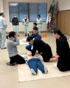 仕事の現場はもちろん、普段の生活でも「突然、人が倒れていたら、あなたは何ができるか」について20代~60代のスタッフ全員が真剣に取組みました。