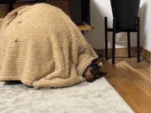 かまくら部屋から顔だけ出して「体デカいぬ」に見えるワンコを添えて